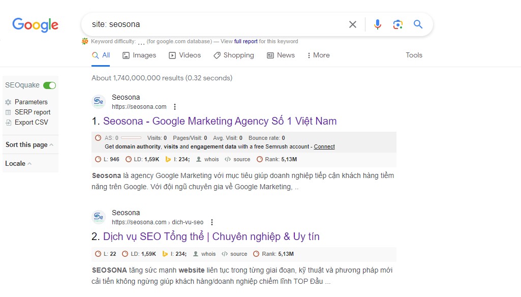 Ví dụ bạn trong nghề SEO, và Seosona là một đối thủ mạnh mẽ của bạn, bạn muốn nghiên cứu Website của Seosona, bạn có thể sử dụng cấu trúc site: seosona trên thanh công cụ tìm kiếm, bạn sẽ thấy được tất cả các bài viết, danh mục đã được Google index của Seosona.